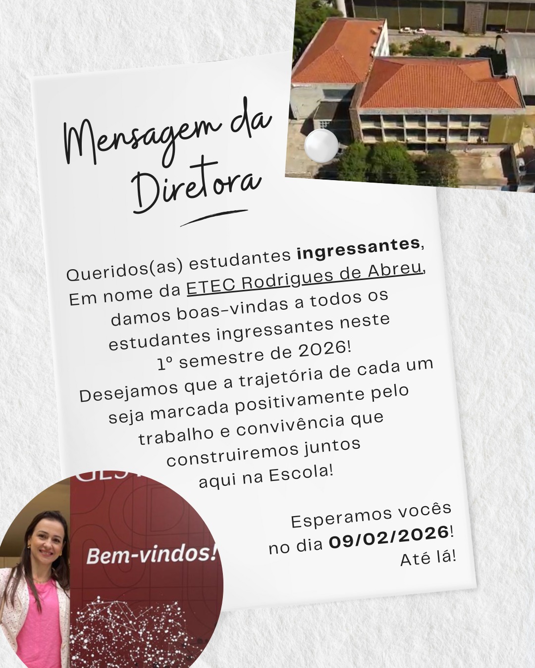 A Superintendente da Etec Rodrigues de Abreu dá as Boas-Vindas aos estudantes ingressantes no 1º Semestre de 2026. Sejam todos muito bem-vindos!