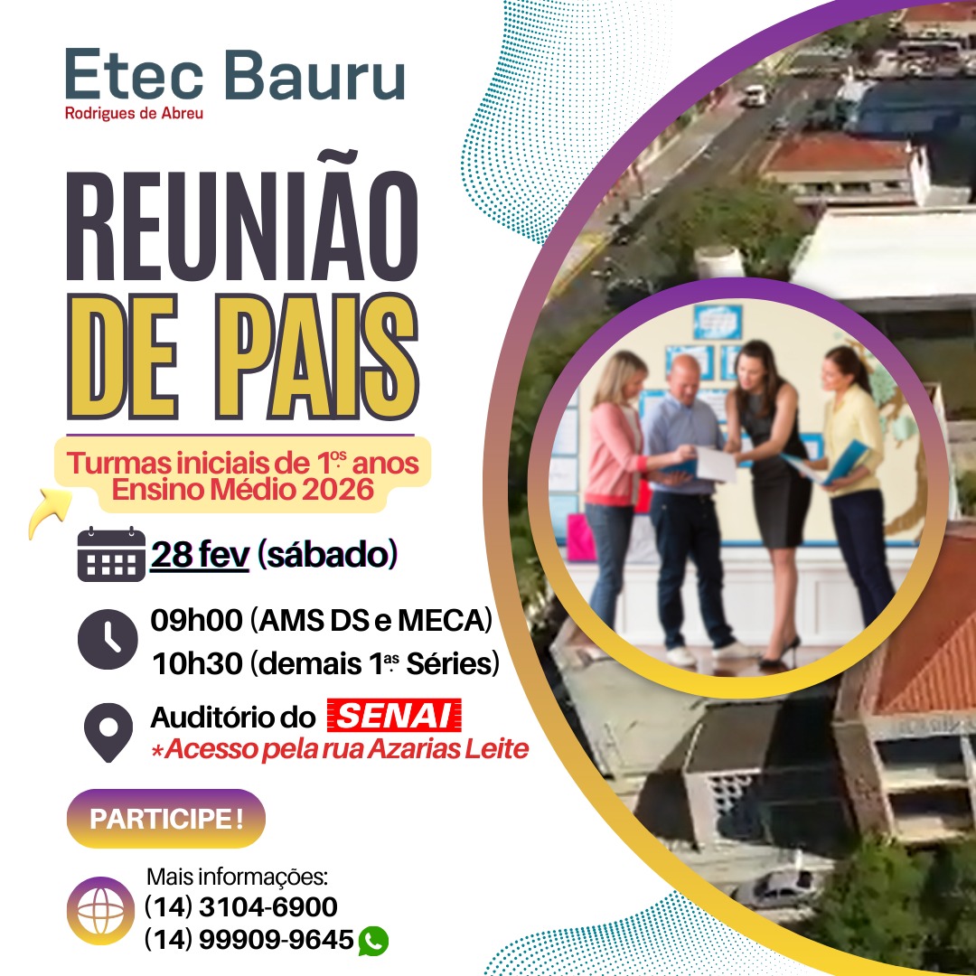 A Etec Bauru – Rodrigues de Abreu convida os pais e responsáveis dos alunos das turmas iniciais do 1º ano do Ensino Médio 2026 para a Reunião de Pais, que será realizada no dia 28 de fevereiro (sábado), no Auditório do SENAI (acesso pela rua Azarias Leite).