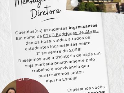 A Superintendente da Etec Rodrigues de Abreu dá as Boas-Vindas aos estudantes ingressantes no 1º Semestre de 2026. Sejam todos muito bem-vindos!