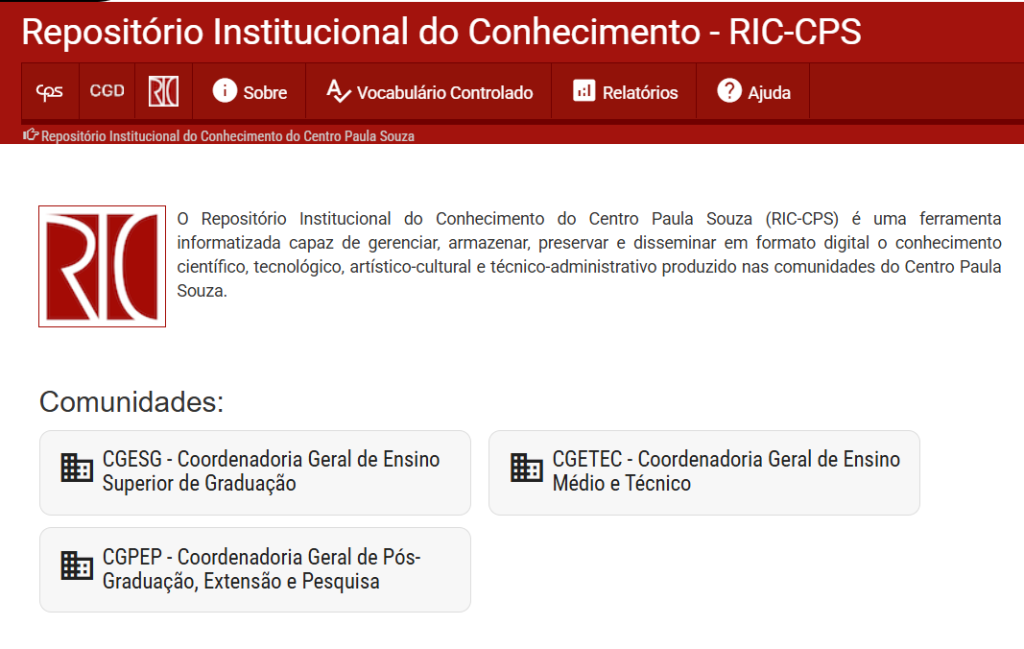 O Repositório Institucional do Conhecimento do Centro Paula Souza (RIC-CPS) é uma ferramenta informatizada capaz de gerenciar, armazenar, preservar e disseminar em formato digital o conhecimento científico, tecnológico, artístico-cultural e técnico-administrativo produzido nas comunidades do Centro Paula Souza.