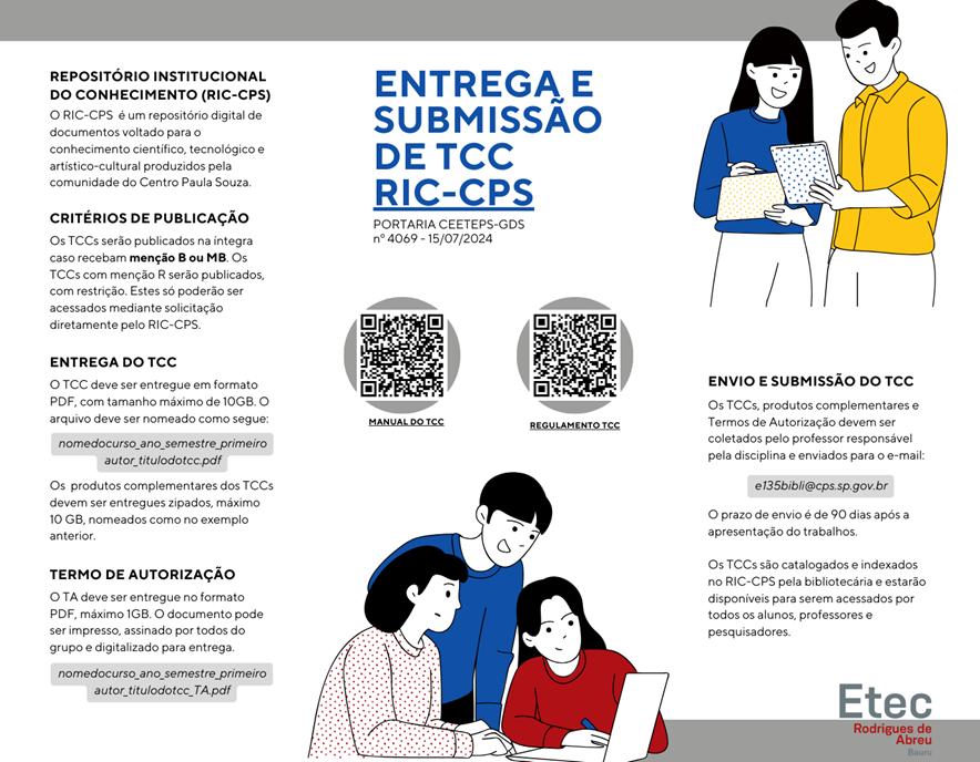 O Trabalho de Conclusão de Curso (TCC), terminologia u lizada pelos cursos presenciais e a distância do Ensino Médio e Técnico, e o Trabalho de Graduação (TG), terminologia u lizada pelos cursos presenciais e a distância do Ensino Superior de Graduação, constituem-se numa atividade acadêmica de sistematização do conhecimento sobre um objeto de estudo permanente à profissão, desenvolvida mediante orientação, acompanhamento e avaliação docente, cuja realização é requisito essencial e obrigatório para obtenção do diploma de Técnico de Nível Médio ou de Tecnólogo de Nível Superior, desde que previstos nos planos de cursos das Etecs e nos projetos pedagógicos das Fatecs.
