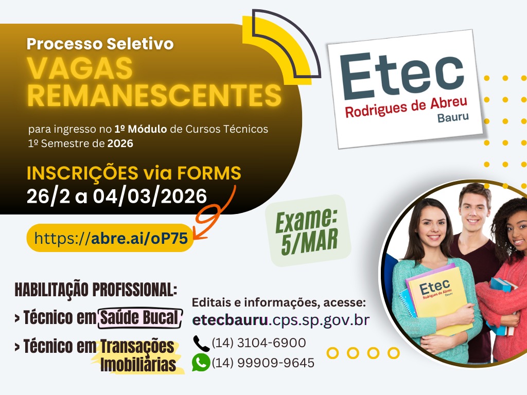 A Etec Rodrigues de Abreu – Bauru informa que estão abertas as inscrições para o Processo Seletivo de Vagas Remanescentes, destinadas ao ingresso no 1º módulo dos Cursos Técnicos, para o 1º semestre de 2026.
